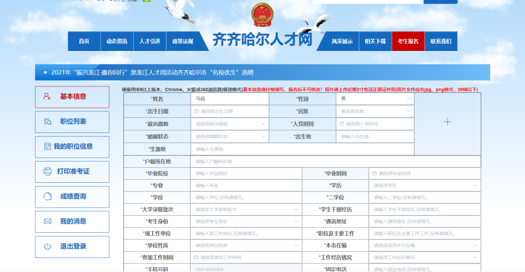 点击左侧“功能菜单”栏下的“基本信息”,完善考生基本信息,并确保填报信息及提供佐证材料真实有效。